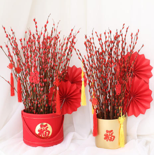 银柳,它谐音“银楼”、“银留”,有银又有楼,寓意招财进宝、财源滚滚,一直有“旺财之花”的美誉,可以说是过年必买的花材之一。它形态优美,细长的枝条潇洒自然,毛绒绒的银芽软萌可爱,象征着节节高升;不过为了增添节日氛围,银柳切枝通常都会被染成红色,家里瓶插几支,红红火火,招财又招福。