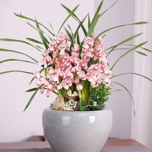 大花蕙兰是近年来很受大家喜爱的祥瑞花卉,它寓意丰盛祥和、富贵吉祥,花期依品种不同能从10月份开到第二年4月份,是冬春时节主要的盆花之一。它植株雄伟挺拔,株型优美大方,纤长秀丽的花茎或直立或下垂,硕大的花朵色彩艳丽、异彩纷呈,花型整齐而美观,观赏价值非常高。家里养上几盆,花繁色艳,贵气逼人。