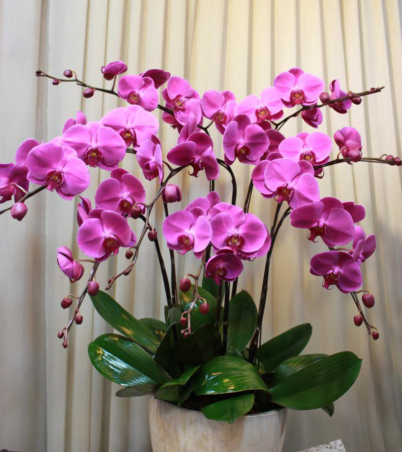 蝴蝶兰是一种兰科植物,其花朵形似蝴蝶,具有蝴蝶般的美丽,故名蝴蝶兰。它的品种繁多,花形和花色富于变化,花姿十分美观,而且能在每年春节前后开花,是非常美丽的一种观赏花卉。养蝴蝶兰要使用透气性排水好的材料,一般会用到水苔、陶粒或火山石等。除了在花期可以将蝴蝶兰盆栽套在一个好看的陶瓷盆里观赏。在其他生长季节,可以将蝴蝶兰放在一个透明的容器里面养着,底部要有排水孔,保持水苔微微湿润,但不要潮湿,维持较高的空气湿度。蝴蝶兰要养在通风透光位置,每天有3~5小时左右的散射光,养护的环境维持较高的空气湿度,这样的环境就有利于蝴蝶兰孕育花朵。